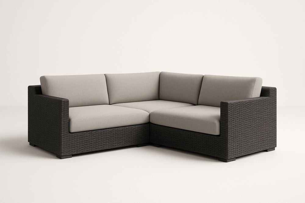 Narożnik ogrodowy z technorattanu w kolorze szarym z poduszkami na siedzisko z pianki, 210 cm.