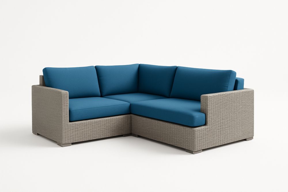 Narożnik zewnętrzny z technorattanu z niebieskimi poduszkami